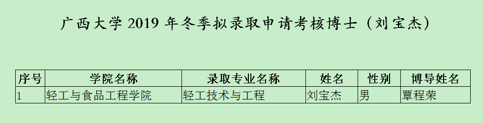 经学校审核,beat365手机版官网入口拟录取刘宝杰为2019年冬季批次申请考核博士,现予以公示,公示期3天。在公示期内如对拟录取名单有异议,请以书面形式,并署真实姓名和联系方式,于公示日结束前送(寄)至研究生院,联系电话:0771-3232142,电子邮箱:liuyist@163.com。群众如实反映意见受法律保护。