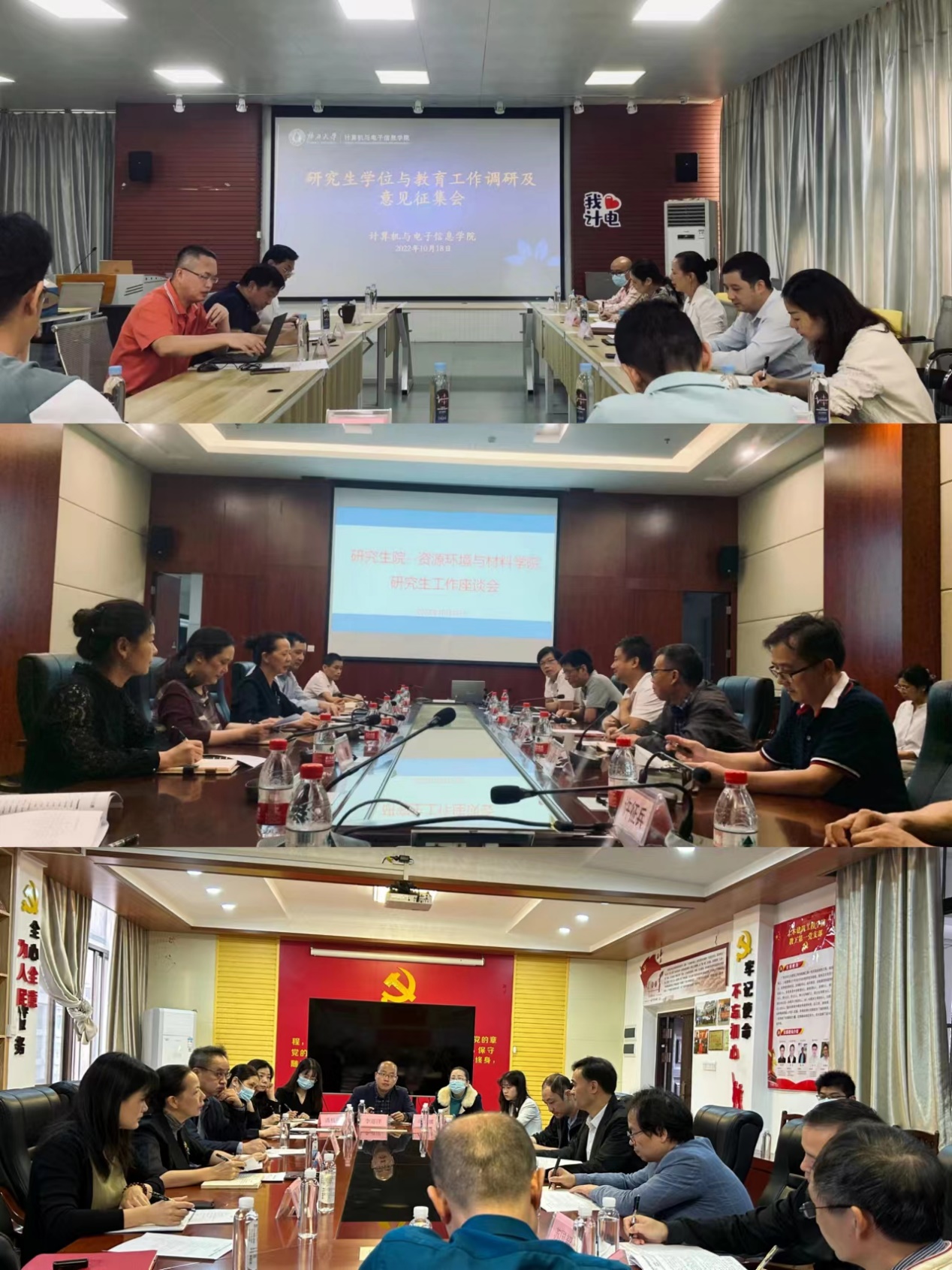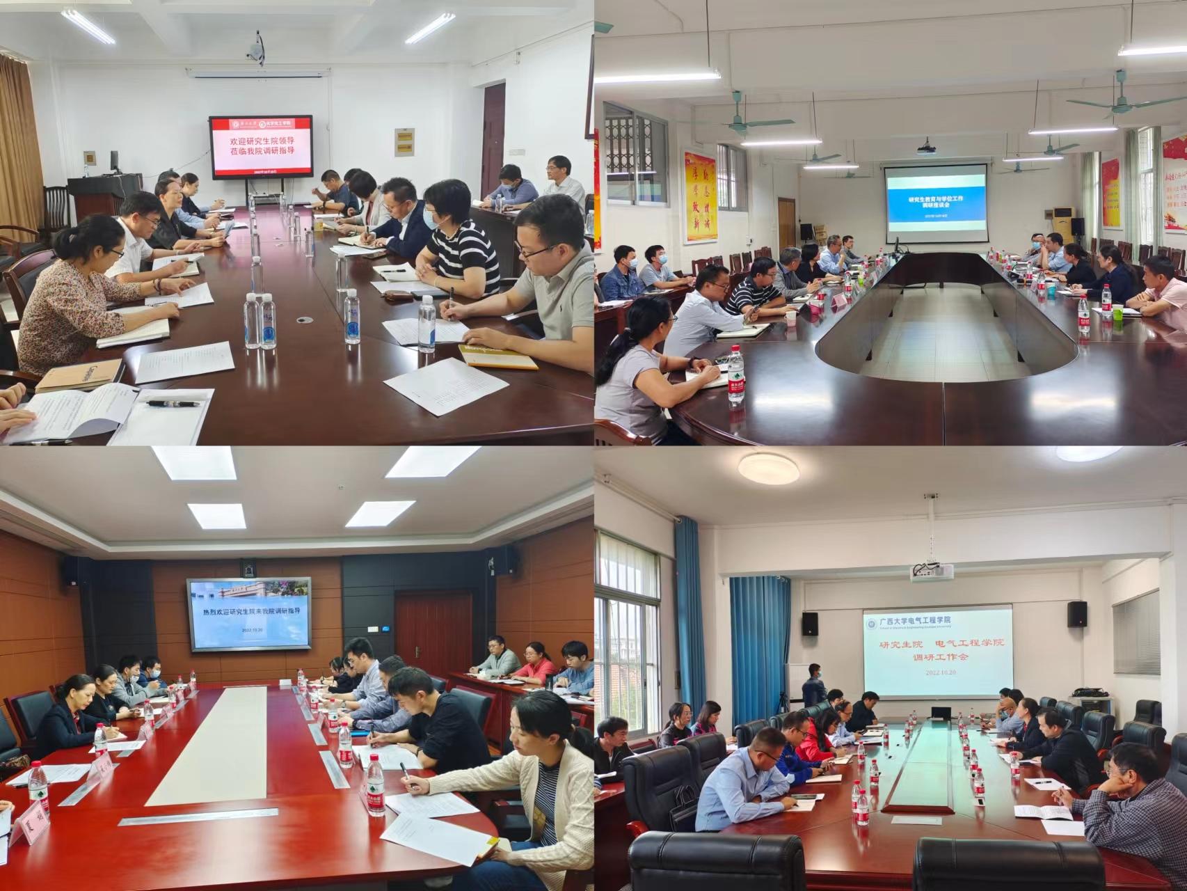 日前,研究生院启动二级学院走访调研工作。调研组由研究生院负责人、相关岗位工作人员以及校学位评定委员会委员组成。10月17日至21日,调研组前后走访了资源环境与材料学院、计算机与电子信息学院、化学化工学院、机械工程学院、轻工与食品工程学院、电气工程学院、土木建筑工程学院7个学院。各学院的负责人、研究生教育分管负责人、教师代表、研究生代表参与调研座谈。调研组就学位点建设、招生工作、导师管理、培养工作、学位工作、管理队伍建设、质量倍增计划等议题征询各学院的相关意见,听取学院反馈工作中存在的问题及困难,并及时就师生关注问题给予回应解答。调研人员及时做好记录,会后整理总结反馈问题,以便调研工作结束后形成报告,解决落实具体问题和需求。