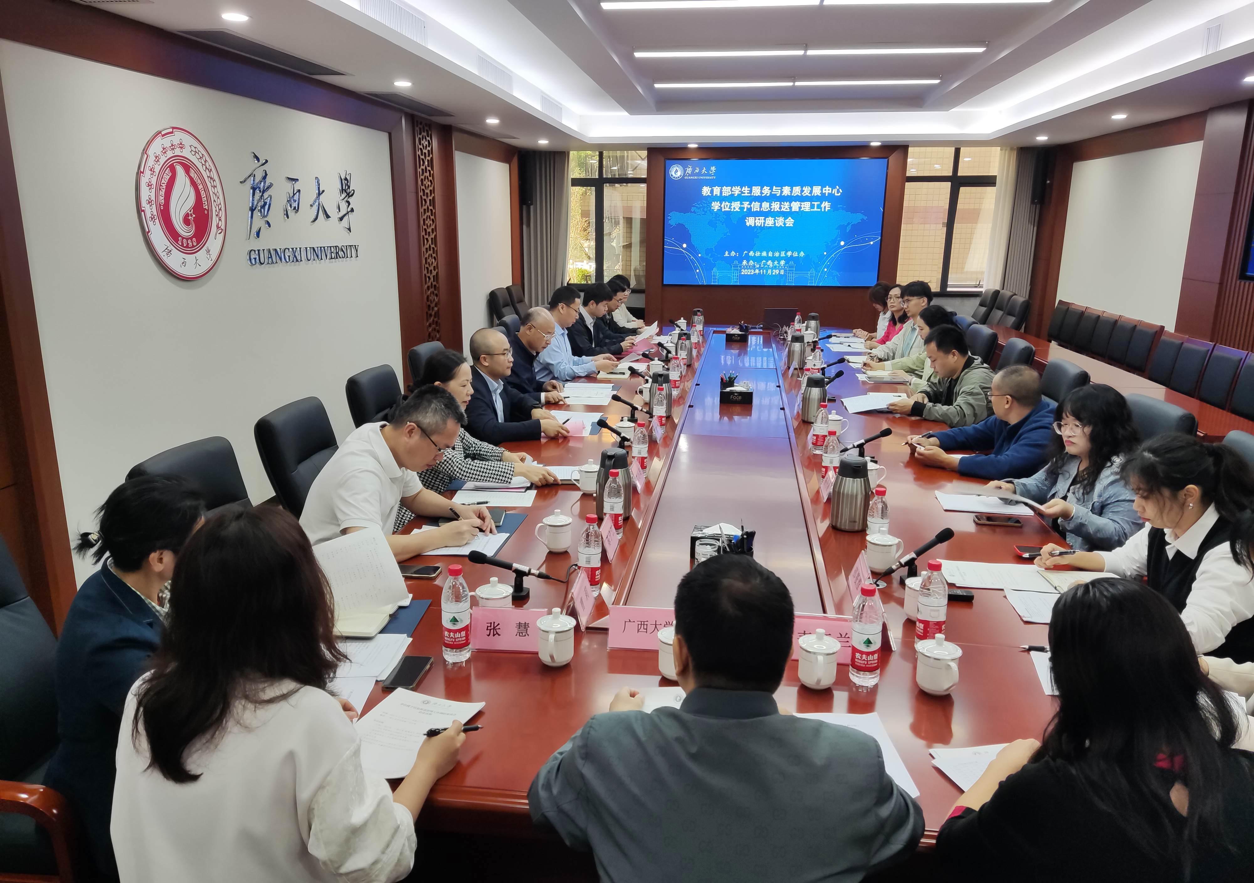 11月29日,教育部学生服务与素质发展中心学籍学历学位处刘云昭处长一行到我校调研,召开广西学位授予信息报送管理工作调研座谈会,自治区学位办副主任陈斌陪同,我校副校长冯家勋出席,研究生院、教务处领导及学校相关部门工作人员参加会议,同时参加座谈会的还有广西医科大学、广西民族大学、南宁师范大学、广西财经学院有关工作人员。