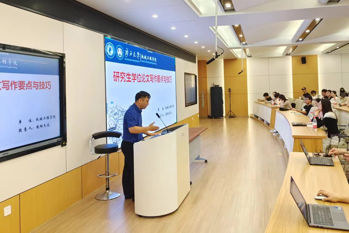 培训分为政策宣讲、优师讲座、软件培训三个部分。政策宣讲环节,校学位办曹莉老师就学校学位申请审核的相关文件规定及学位申请程序进行整体说明,并对重要条款、重要环节进行重点解读。张慧老师则结合学位论文的撰写模版、正面和负面评价案例,对学位论文撰写规范进行逐项解读说明。优师讲座阶段,邀请了优秀学位论文的指导教师、机械工程学院博士生导师欧阳天成副教授作题为《研究生学位论文写作要点与技巧》的报告。欧阳副教授从论文选题、论文撰写、学术诚信等方面,向在场研究生倾囊相授个人指导和评阅论文的经验和心得。软件培训阶段,知网的两位专家就学位论文规范检查软件、AI论文检测软件应用进行介绍。