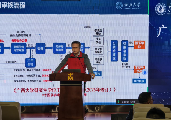 副院长陈宁江则聚焦学位论文质量保障体系,系统介绍了学位论文质量保障体系,包括论文选题的创新性要求、研究过程的规范性监督、盲审评阅的具体标准以及答辩程序的严格执行等内容,通过具体案例剖析了各环节常见问题及防范措施,强化导师对培养质量的全程把控意识。