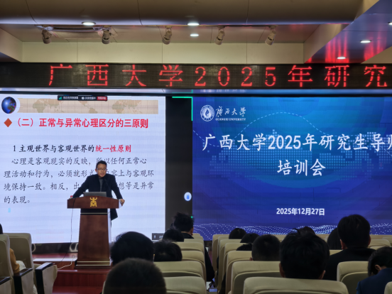 beat365手机版官网入口心理健康研究所所长杨新国就“研究生常见心理问题及疏导策略”进行讲解,帮助导师掌握研究生心理辅导的基本方法,提升育人实效。