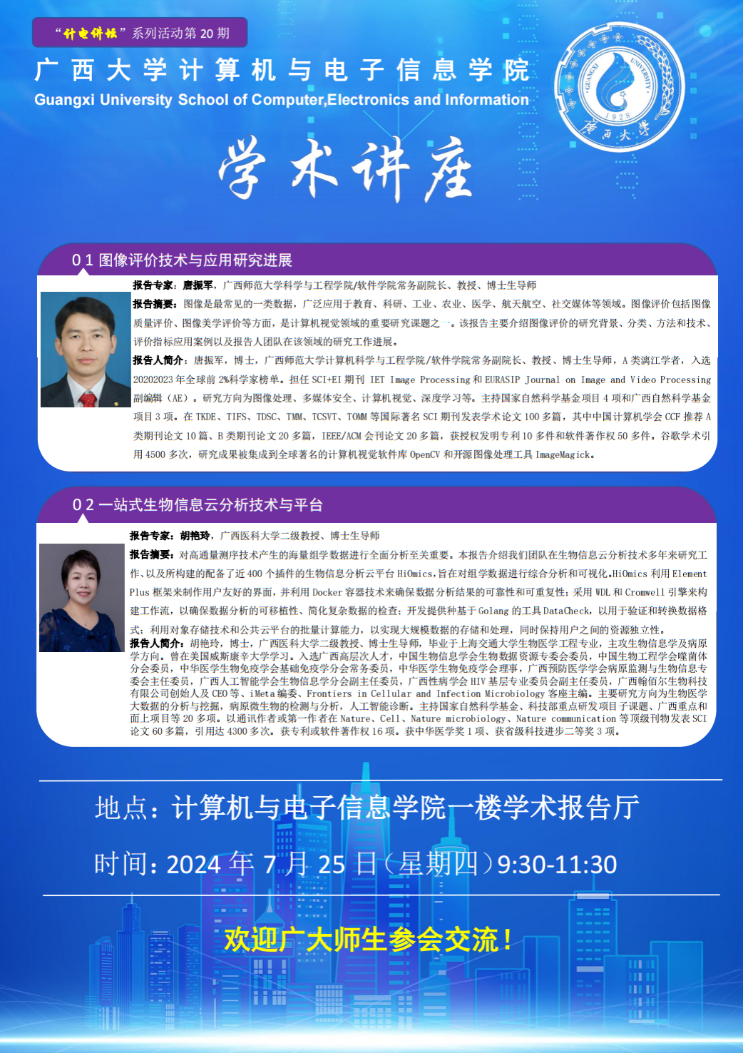 计算机与电子信息学院学术报告:1.图像评价技术与应用研究进展;2.一站式生物信息云分析技术与平台