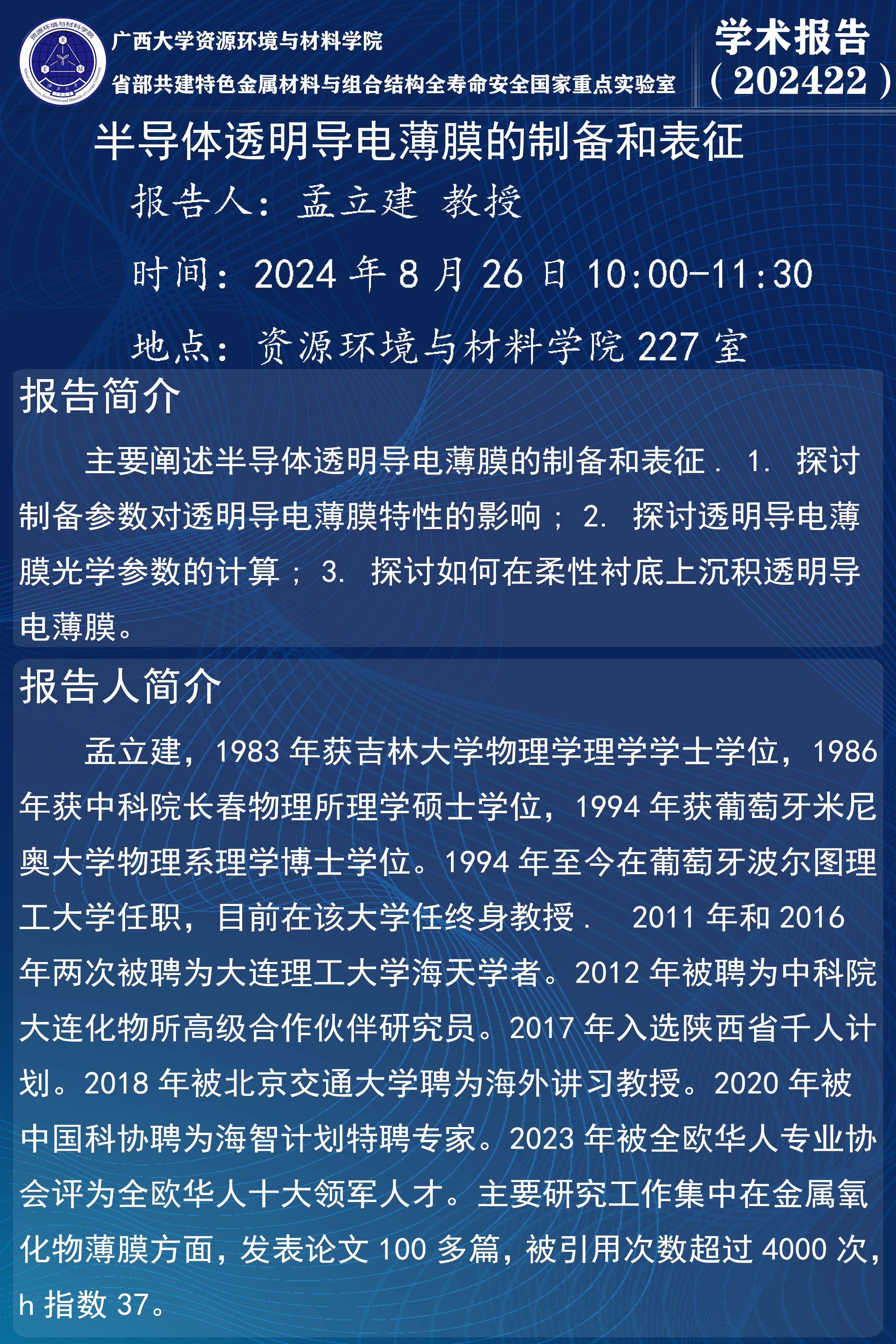资源环境与材料学院学术报告:半导体透明导电薄膜的制备和表征
