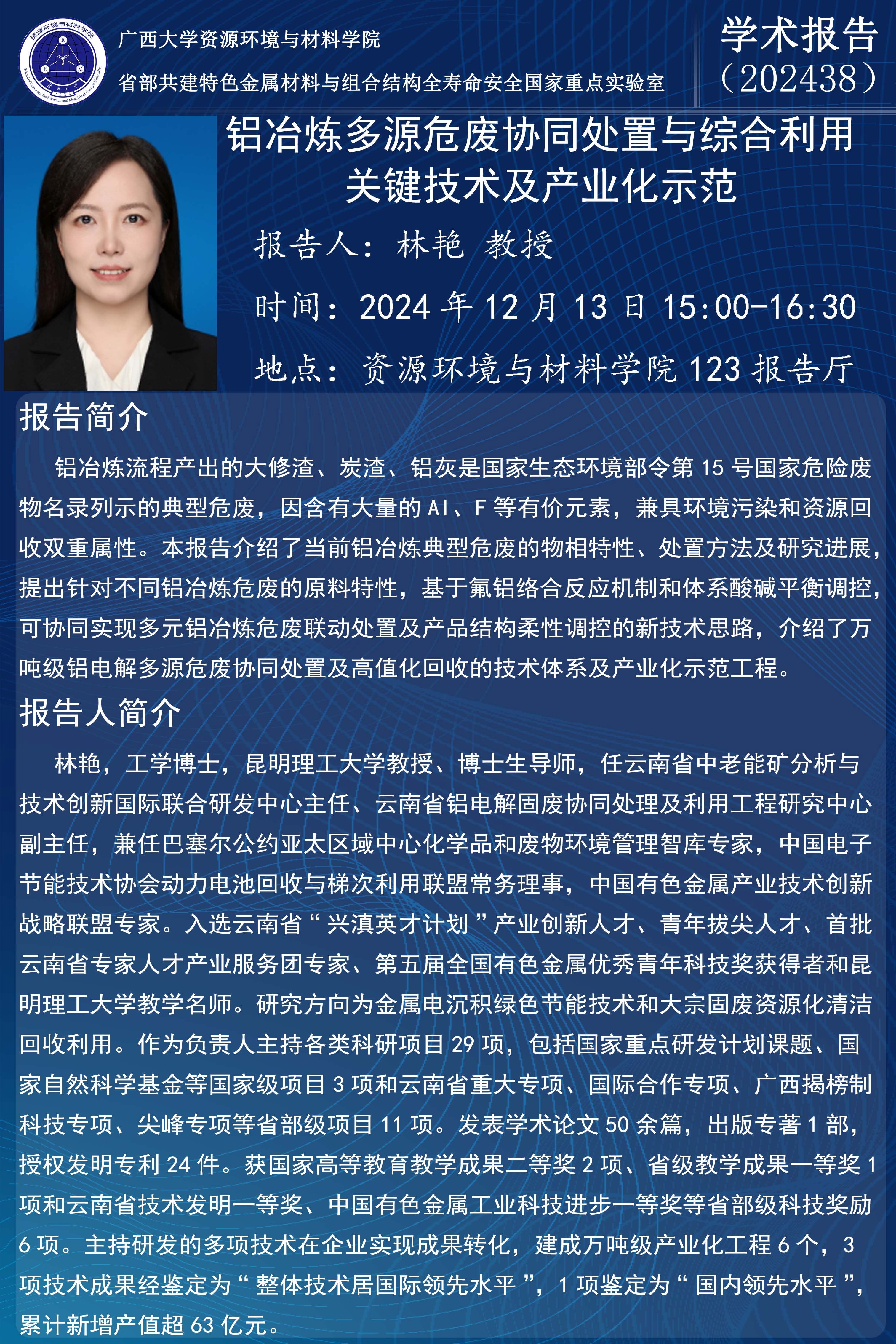 资源环境与材料学院学术报告:铝冶炼多源危废协同处置与综合利用关键技术及产业化示范