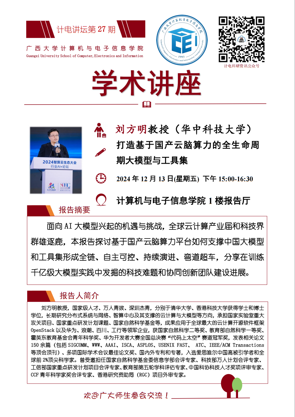“计电讲坛”系列活动第27期学术报告会:1.打造基于国产云脑算力的全生命周期大模型与工具集;2.当云遇见AI——云端分布式深度学习系统