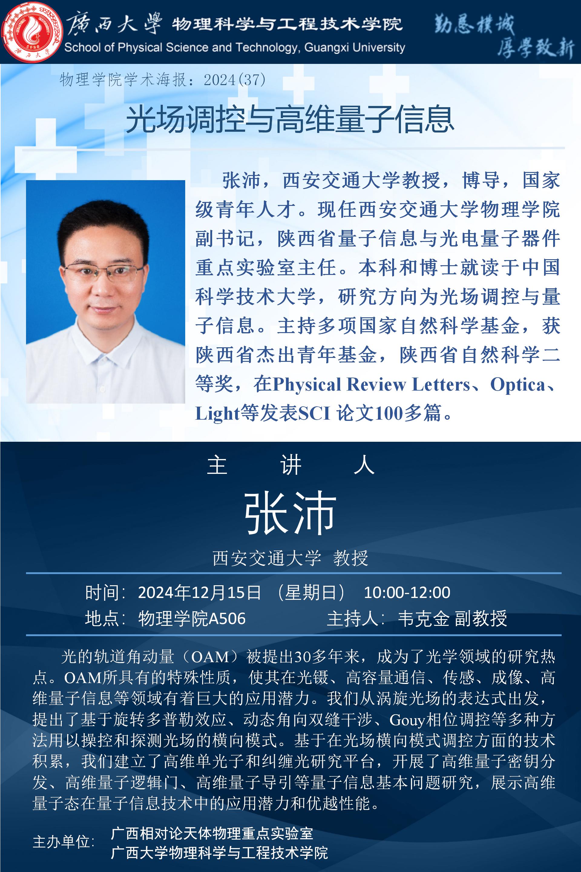 物理学院学术报告:光场调控与高维量子信息