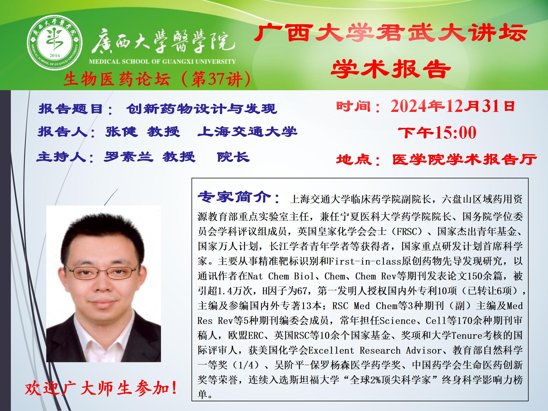 君武大讲坛、医学院学术报告:创新药物设计与发现