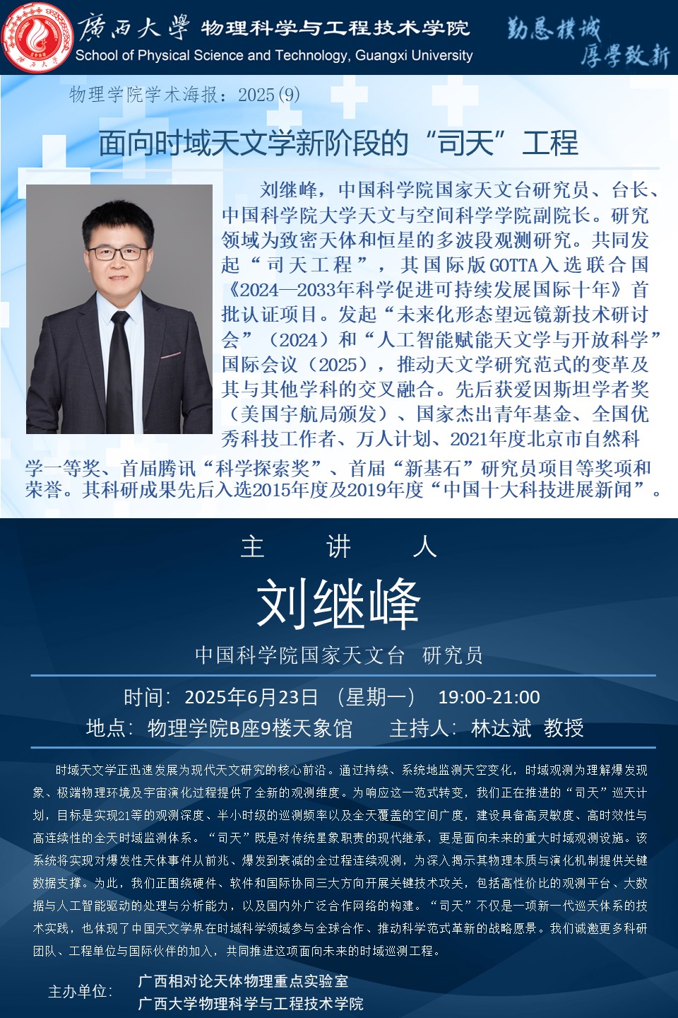 物理科学与工程技术学院学术报告:面向时域天文学新阶段的“司天”工程