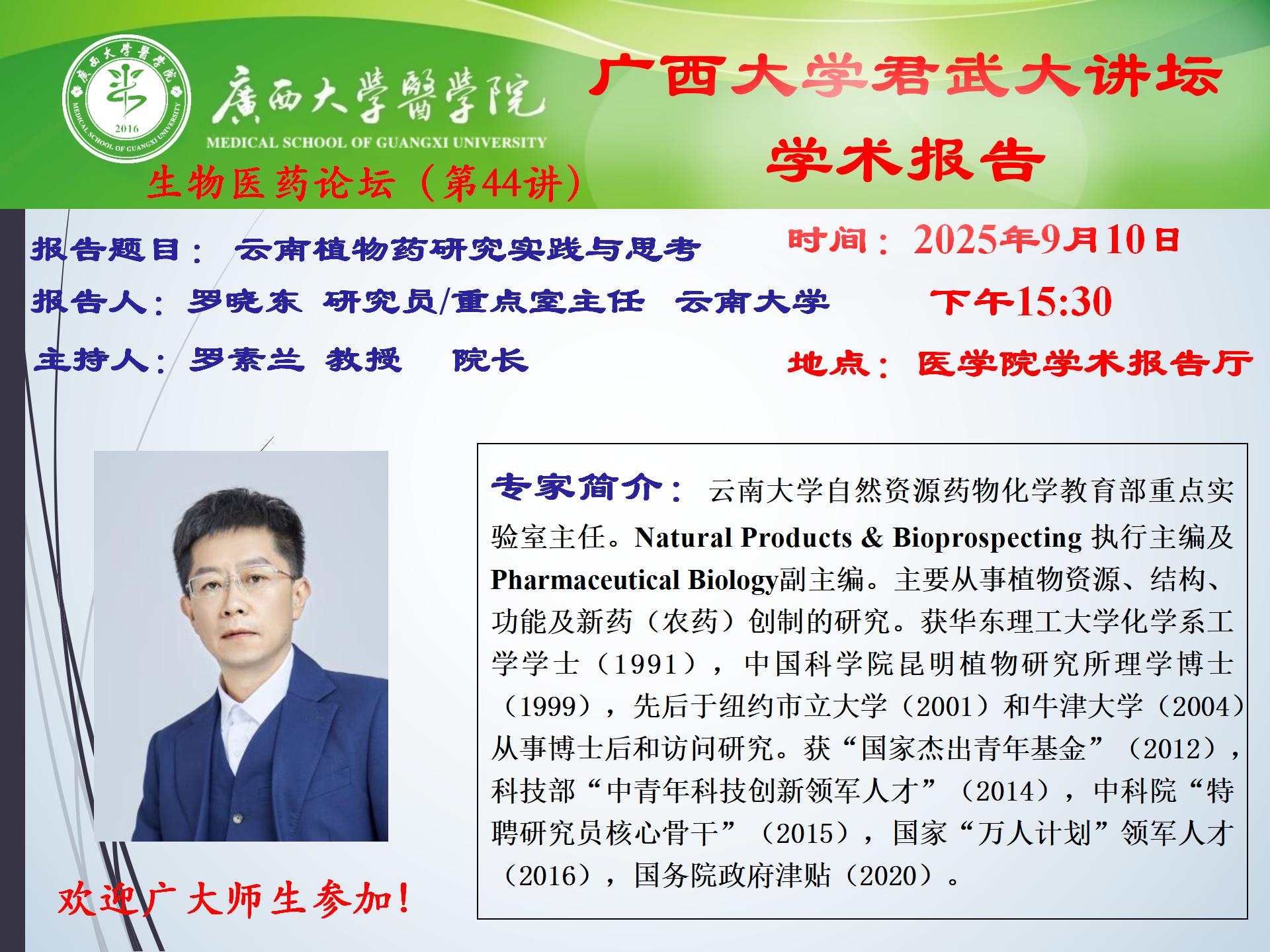 君武大讲坛、医学院学术报告:云南植物药研究实践与思考