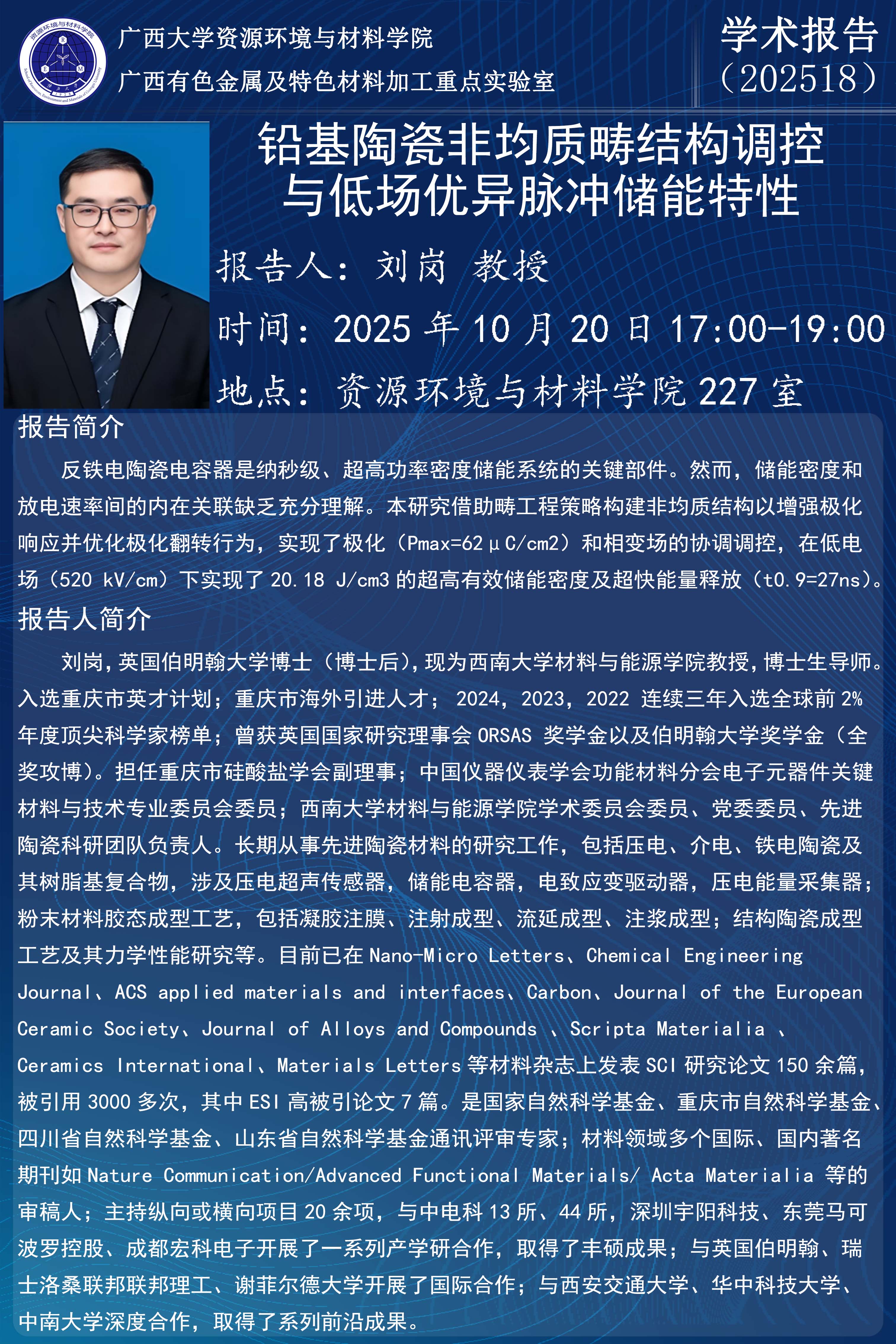 资源环境与材料学院学术报告:铅基陶瓷非均质畴结构调控与低场优异脉冲储能特性