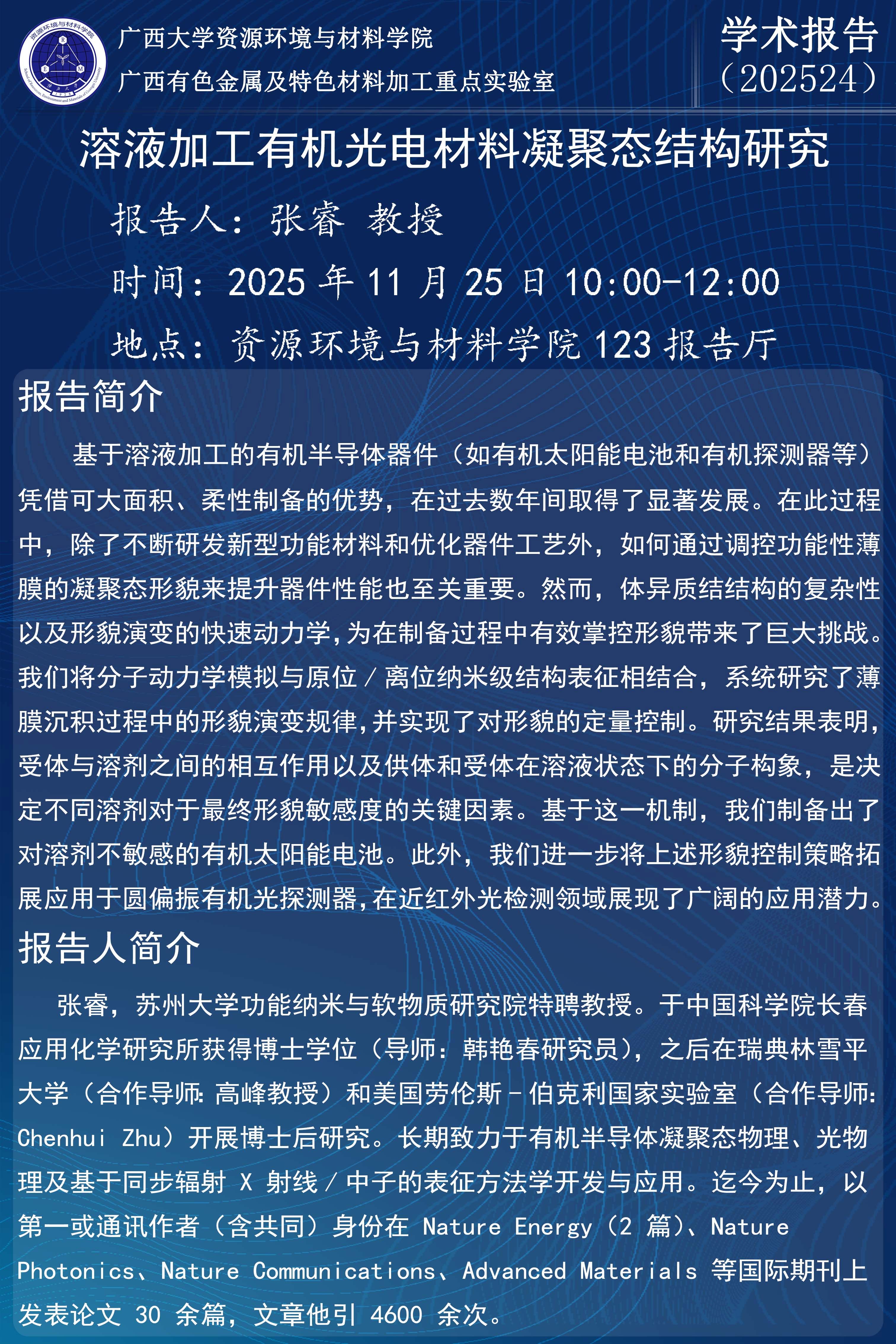 资源环境与材料学院学术报告:溶液加工有机光电材料凝聚态结构研究