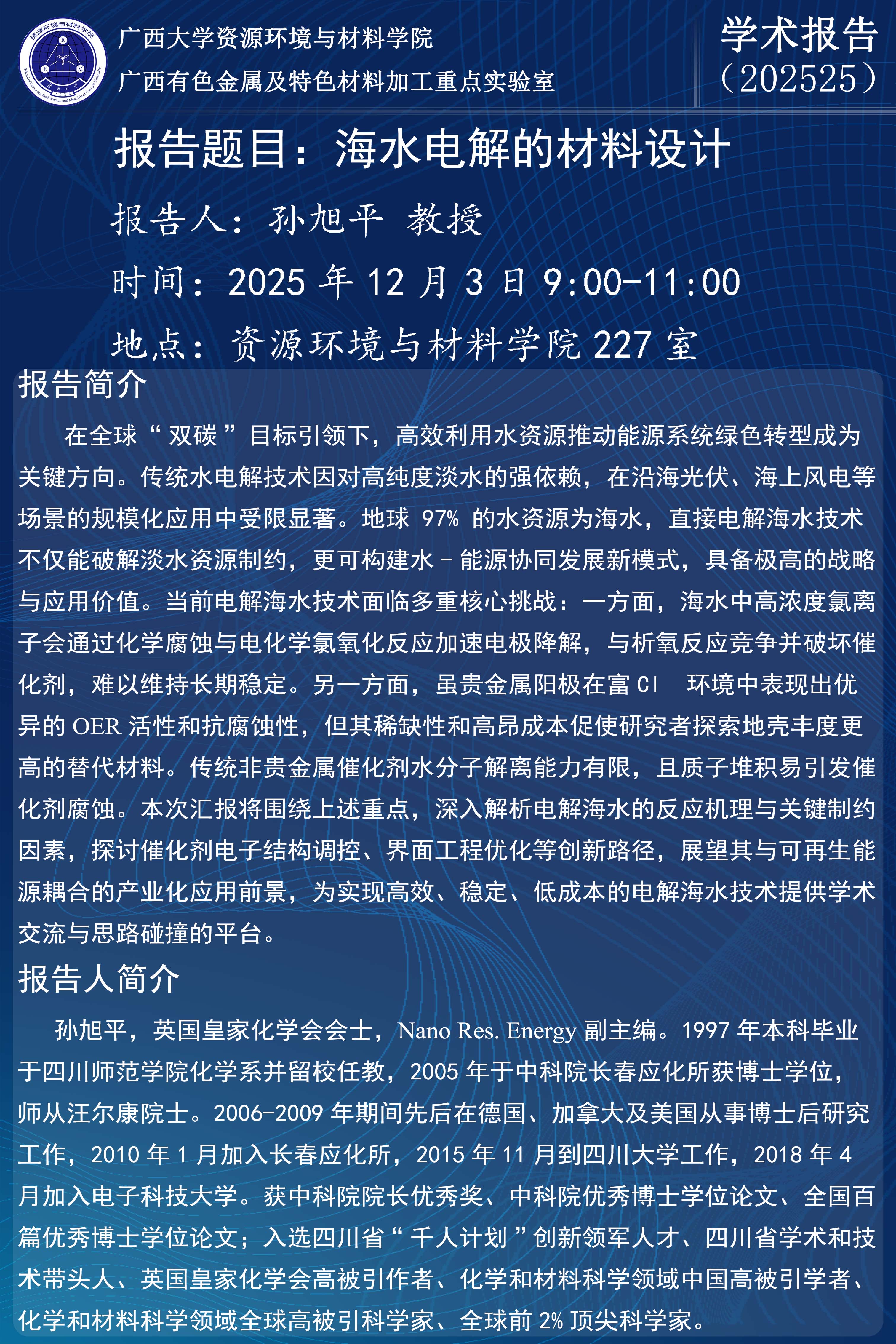 资源环境与材料学院学术报告:海水电解的材料设计