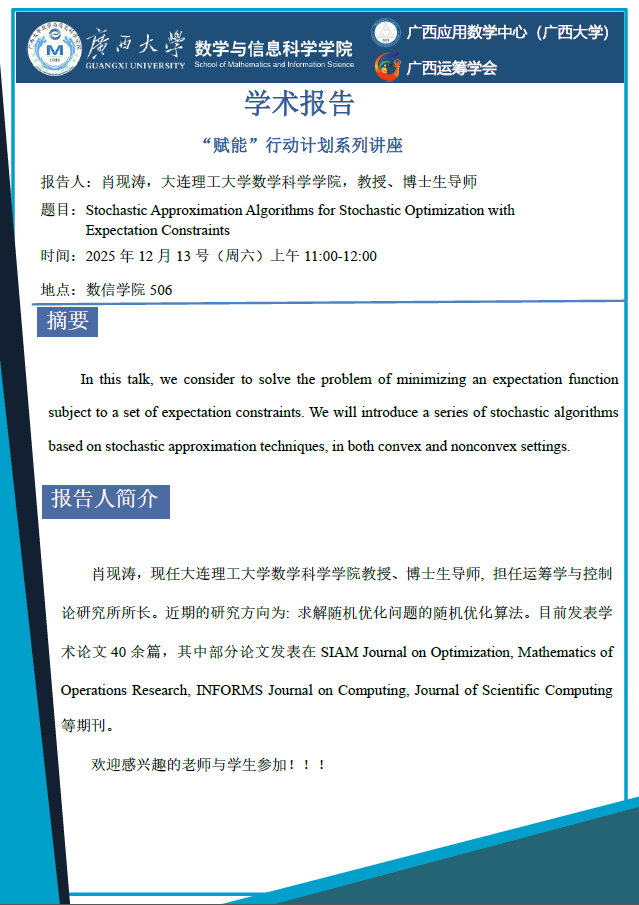 数学与信息科学学院学术报告:Stochastic Approximation Algorithms for Stochastic Optimization with Expectation Constrai...